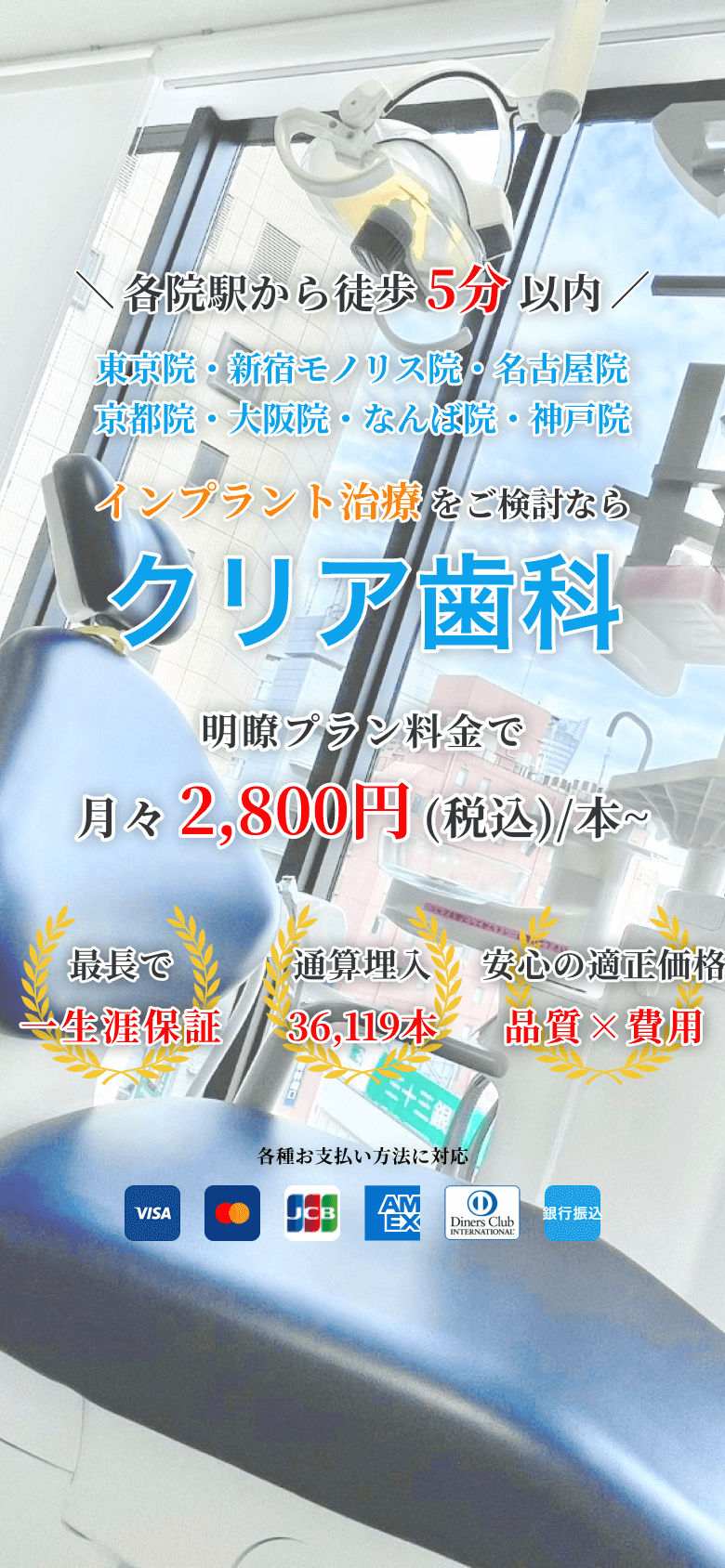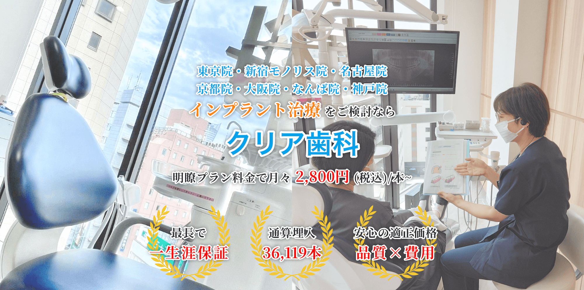 クリア歯科グループの埋入実績は累計36,119本、平均年間2,163本。こうした実績・経験を元にして、様々な症例に対応した治療ノウハウを蓄積し続けています。
