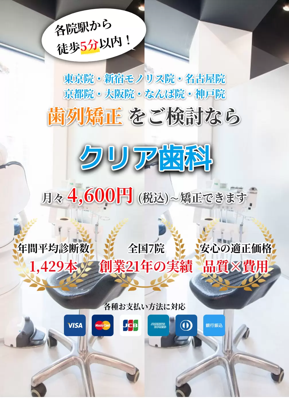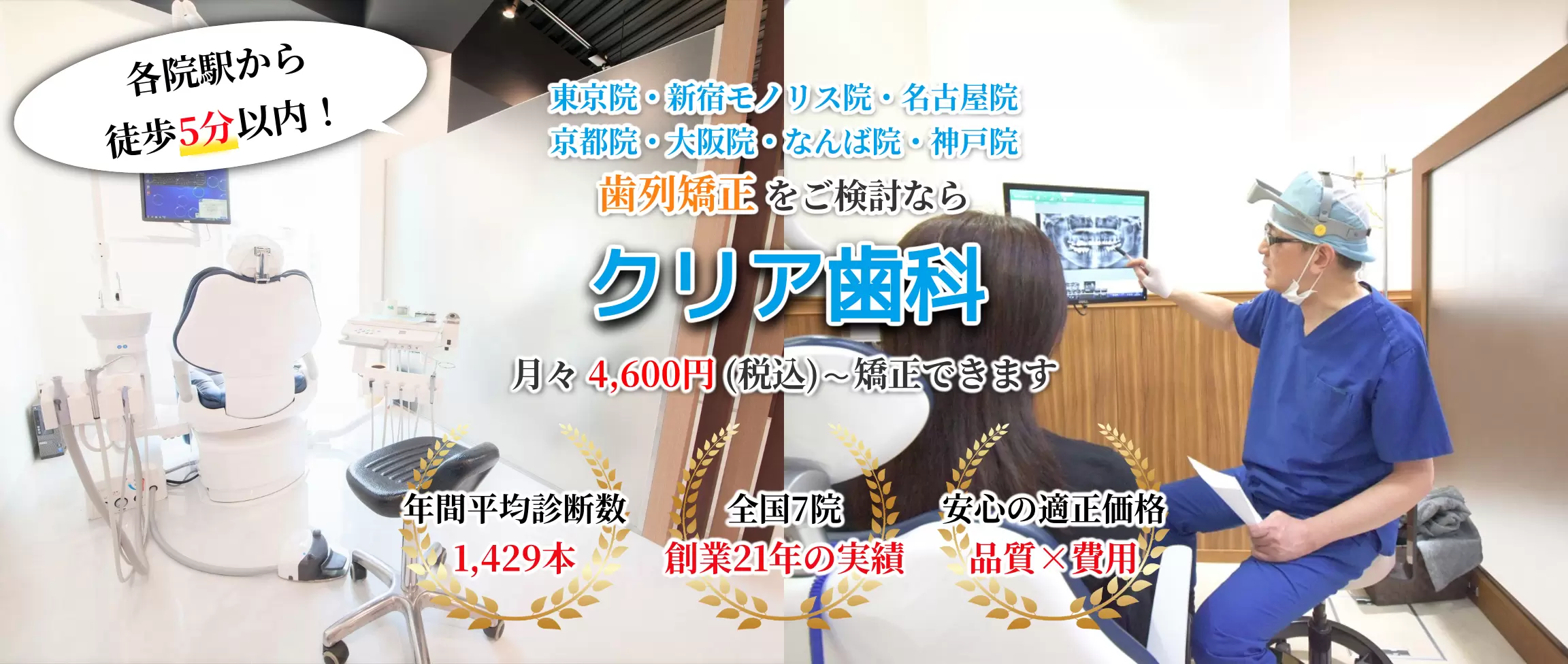 クリア歯科は東京(有楽町)、新宿、名古屋、京都市、大阪市、なんば、神戸の全国7院、創業21年で培ってきた信頼があります。