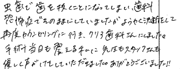虫歯で歯を抜くことになってしまい、歯科恐怖症でそのままにしていましたがようやく決断をして再度カウンセリングに行き、クリア歯科さんにしました。手術当日も震える私に先生もスタッフさんも優しく声がけをしていただきました。ありがとうございました!!