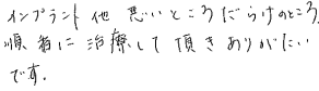 インプラント他、悪いところだらけのところ順番に治療していただきありがたいです。