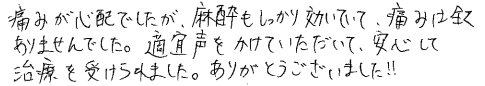 - ご来院いただきありがとうございます。 痛みなく安心して治療を受けていただけたとのことで、スタッフ一同安心いたしました。今後も丁寧なお声がけを大切にしてまいります。