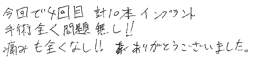 今回で4回目 計10本インプラント手術全く問題なし!痛みも全くなし!ありがとうございました。