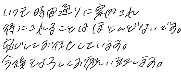 いつも時間通りに案内され待たされることはほとんどないです。安心してお任せしています。今後もよろしくお願い致します。