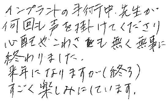 インプラントの手術中、先生が何回も声を掛けてくださり心配やこわさも無く無事に終わりました。来年になりますが(終了)すごく楽しみにしています。